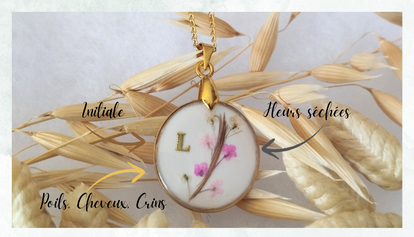 Pendentif en acier inoxydable doré ou argenté, en forme de cercle, renfermant des poils, cheveux ou crins, accompagnés de fleurs séchées sur fond blanc.