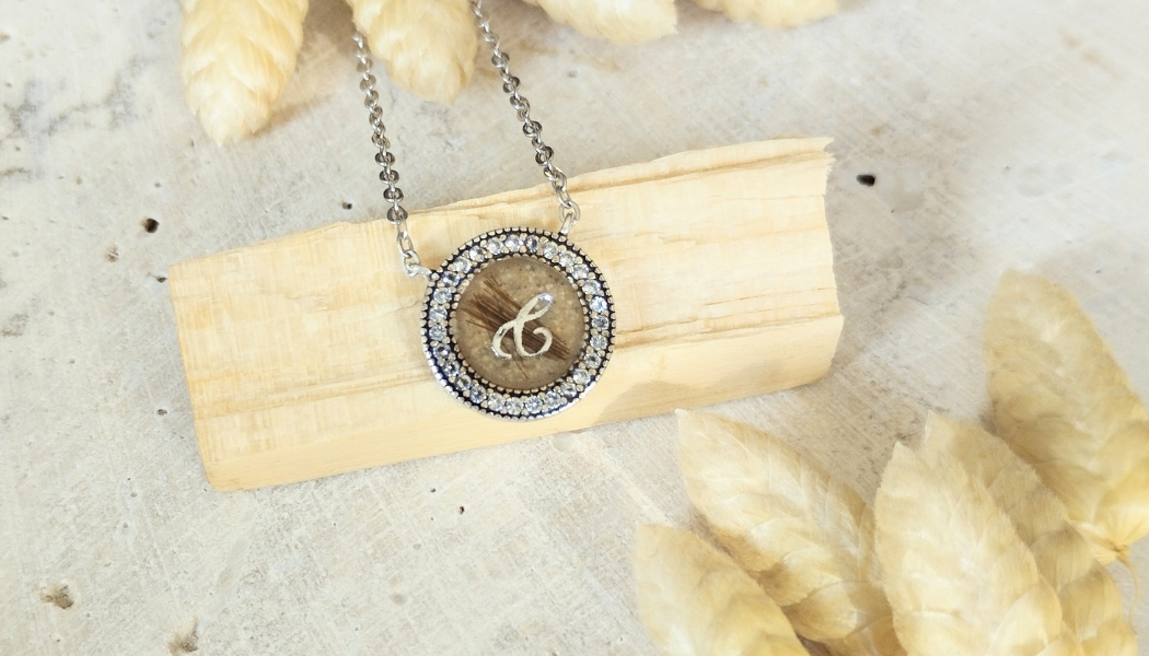 Collier et pendentif en plaqué or 18K ou argent 925, sertis de zirconium, créés pour accueillir un souvenir intime : poils, cheveux, crins, cendres, plume, tissu et bien plus encore.