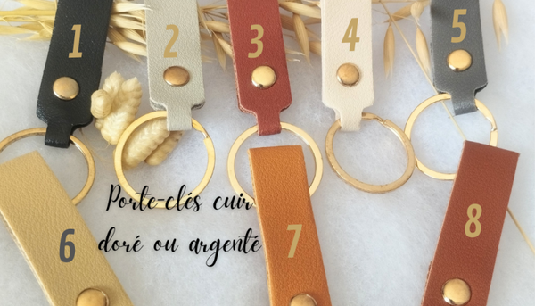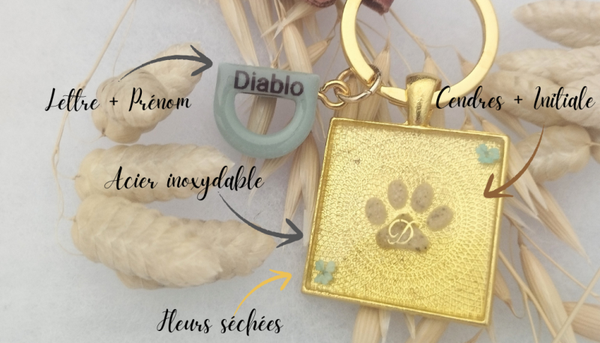 Porte-clés en cuir personnalisé, avec insertion de poils, cheveux, crins ou cendres (en forme de pattes) sur ou sans fond blanc, accompagné ou non de fleurs séchées, d'une initiale ainsi qu'une mini lettre en résine avec prénom.